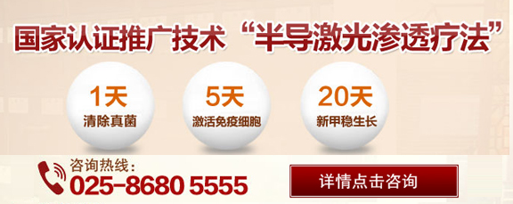 南京肤康皮肤中医门诊部医生提醒大家:灰指甲之所以难以全面科学治疗,是因为患者并没有找到一种真正适合自己的疗法。传统治疗灰指甲的的方法大多口服抗真菌药物,或者涂抹药膏,恢复需要时间较长,而效果不佳,可能再发作发作,不能够全面的恢复灰指甲。然而手术拔甲创伤大,不适合高血压、心脏病患者,危险性强。南京肤康皮肤中医门诊部最新研制出“半导激光渗透疗法”,具有疗程短、见效快、无毒副作用、愈后不再发作。