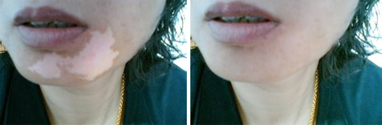 经过一个疗程的治疗,林女士的脸部已经有明显的好转。她告诉医生,在治疗期间,她一直有严重的思想斗争,害怕没有效果,她以前听说白斑很难治,也都想过要放弃,只抱着一丝丝的希望,每天都要和自己做很大的思想斗争。医生告诉她,放宽心,保持良好的心情,恢复的才会更快,不要害怕治疗。
