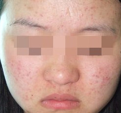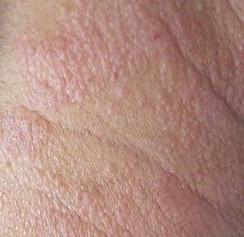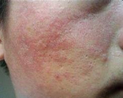 4. 螨虫性皮炎:患者皮肤变粗糙,有脱皮现象。在夜间面部会有瘙痒感。面部多油,毛孔变粗大,鼻周毛孔有黑头并增多。青春痘发作,鼻上痤疮发作,毛血管扩张,皮肤开始增生性肥厚,呈“橘皮状”红肿。前胸、后背生出红色小疙瘩。还出现断发、头发分叉,头皮屑增多等等。
